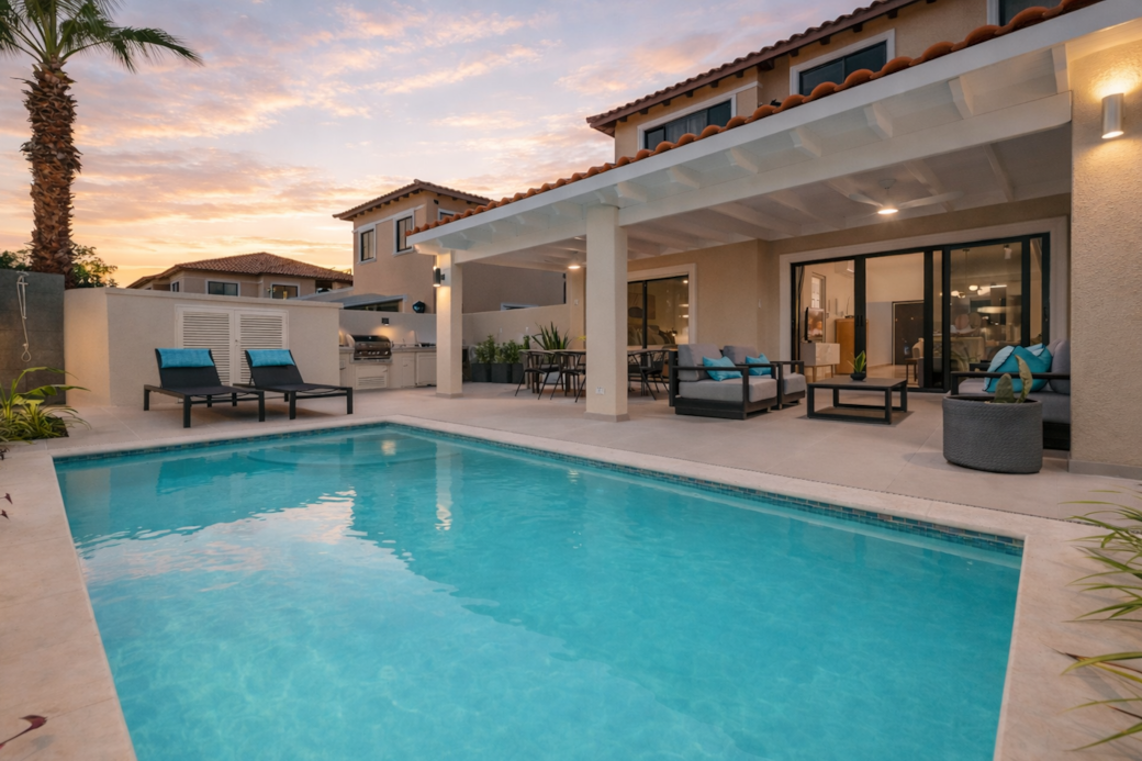 private backyard by night with pool, BBQ, and pagoda-covered dining and lounging areas